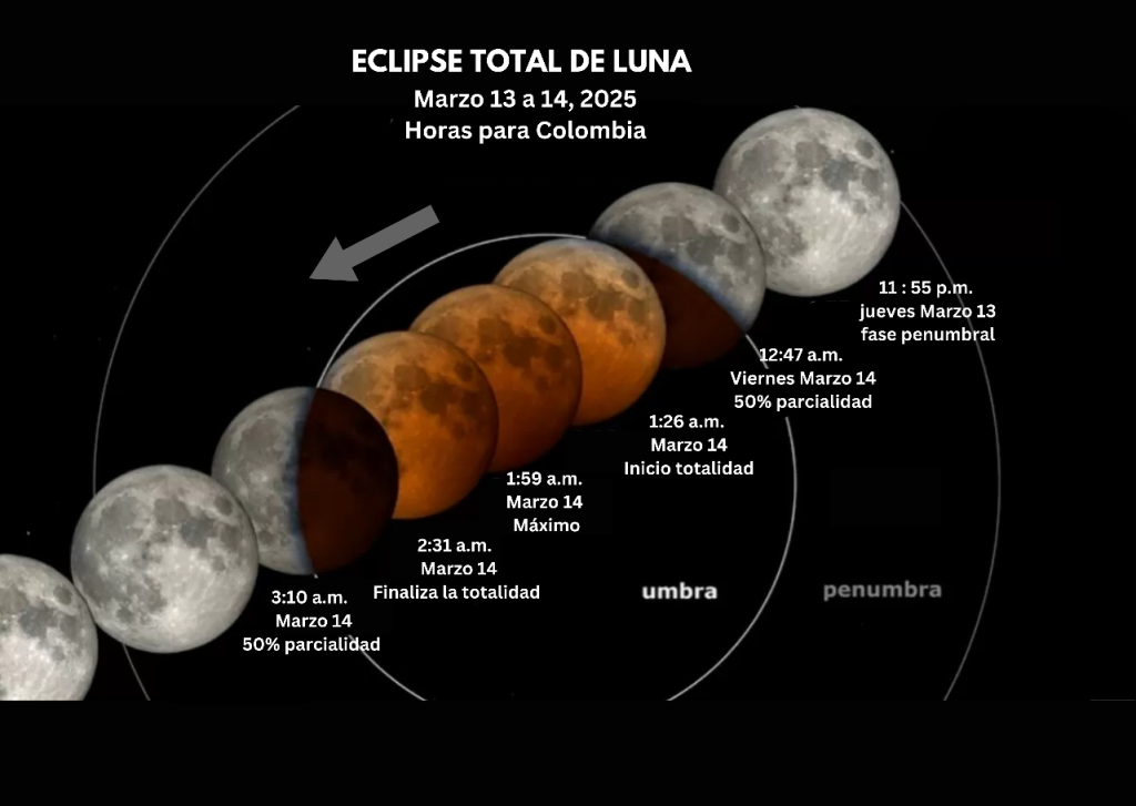 El eclipse comenzará la noche del 13 de marzo y alcanzará su punto máximo a la 1:58 a.m. del 14 de marzo, cuando la Luna estará completamente sumergida en la umbra terrestre y adquirirá su característico tono cobrizo. La totalidad del eclipse se extenderá hasta las 2:31 a.m., brindando un espectáculo fascinante para la comunidad científica y los apasionados por la astronomía.