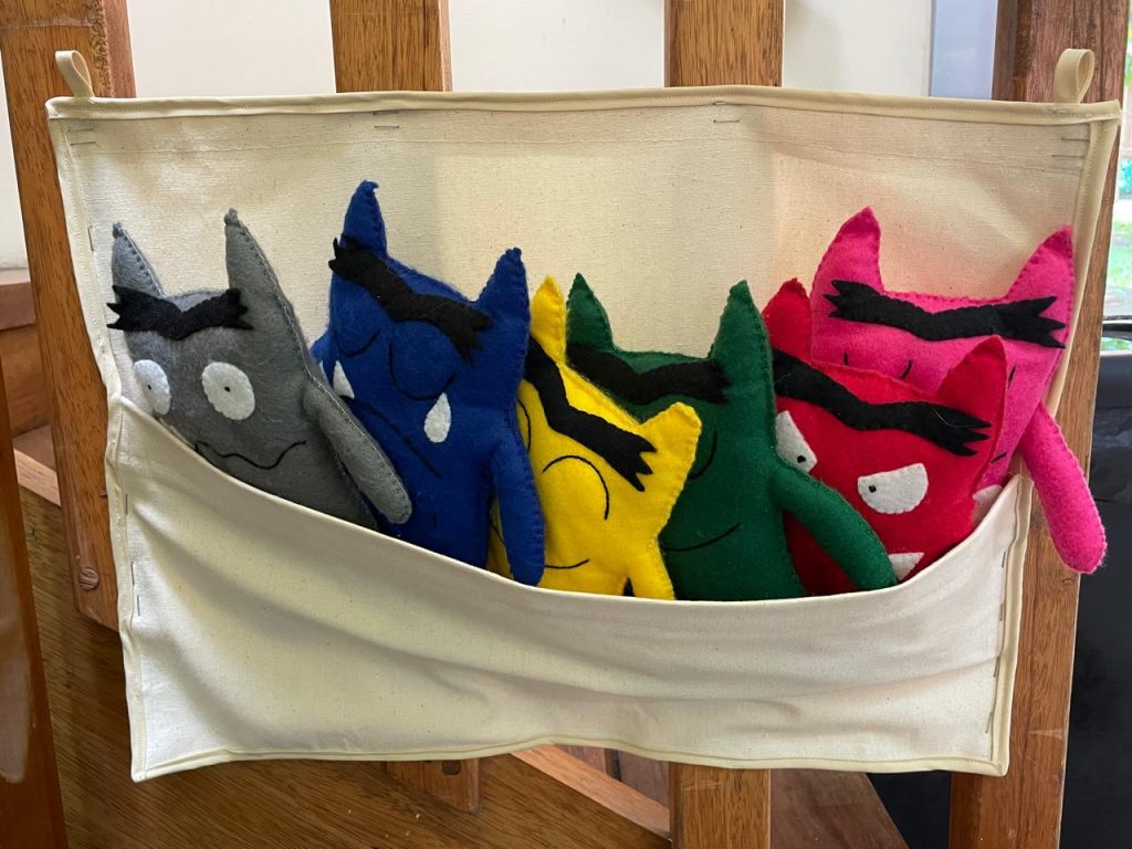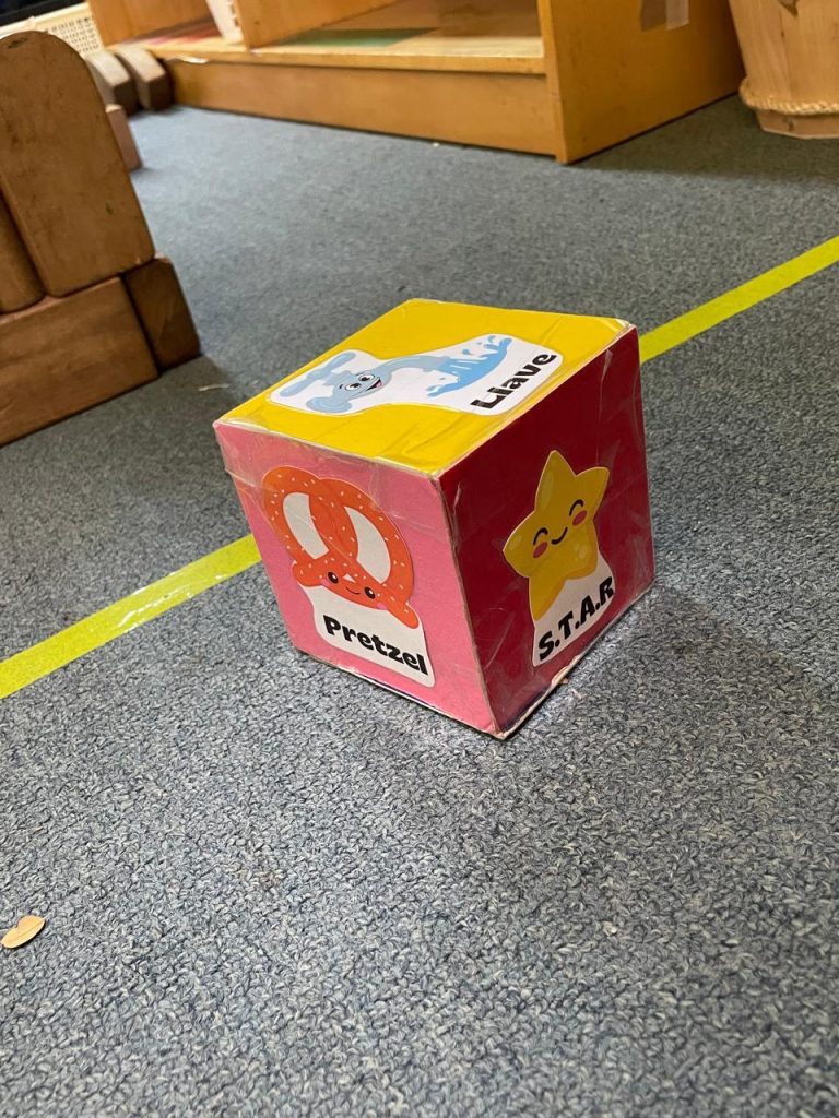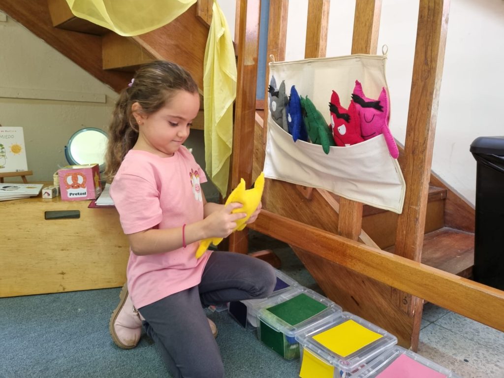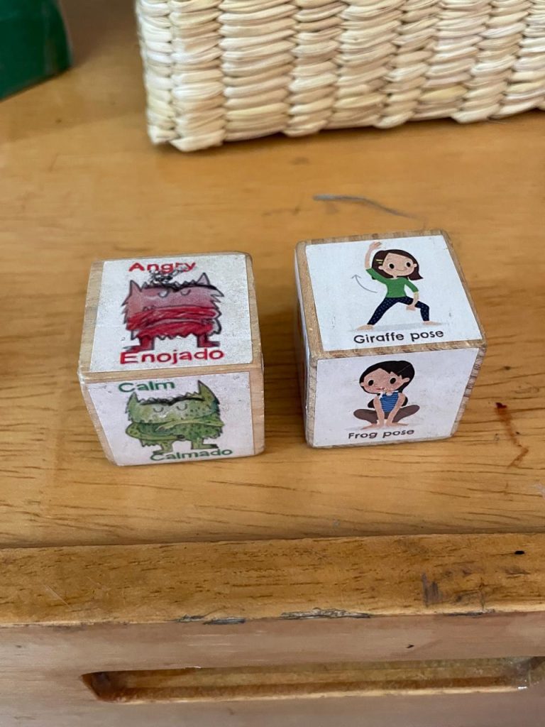 One of these places is the “Peace Corner,” which was born from the story The Color Monster and allowed open discussions about sadness, anger, joy, fear, and other feelings. The children decided which elements they considered important for managing each emotion: from little pillows to family photos, as well as pleasant scents and stuffed animals. Everything was designed with them and by them, including the letters on the sign that names the corner. They also used different cubes, such as the breathing cube or the emotions cube, to guide them in various breathing or dialogue exercises to calm down, along with stamp logs to document their progress.