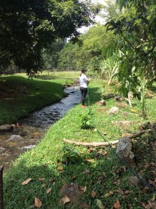 Queremos proteger nuestros bancos de arroyos y también capturar los nutrientes que pasan a través del suelo o sobre el suelo, debido a la escorrentía, antes de que los nutrientes ingresen al arroyo. Esto detiene la eutrofización, la adición de nutrientes a los arroyos, ríos, vías fluviales que pueden llevar a un aumento en la formación de algas. Si bien no usamos agroquímicos, fertilizantes o pesticidas en el jardín, sí agregamos abonos orgánicos y compost a nuestras plantas de café, que están en una pendiente.