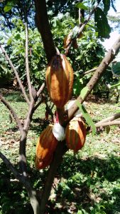 Durante la presentación del cacao, realizada por Marisol Cano y el Dr. Xavier Argout del CIRAD (Centre de coopération internationale en recherche agronomique pour le développement), se mostró a los estudiantes el cultivo de cacao en el campo y vieron diferentes tipos de cacao mostrando variación en el color, tamaño y forma de la mazorca.