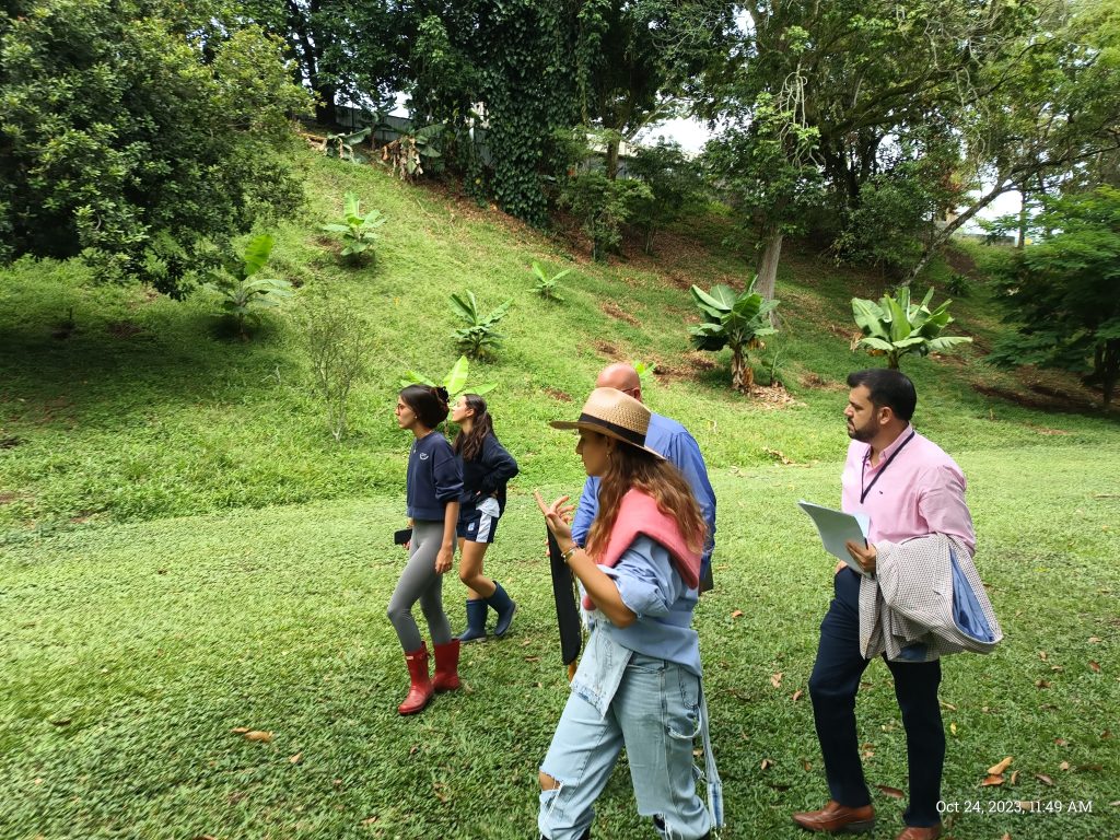 Students taking the accreditation team to the garden and showing them the growing banana plants in the cacao plot.
