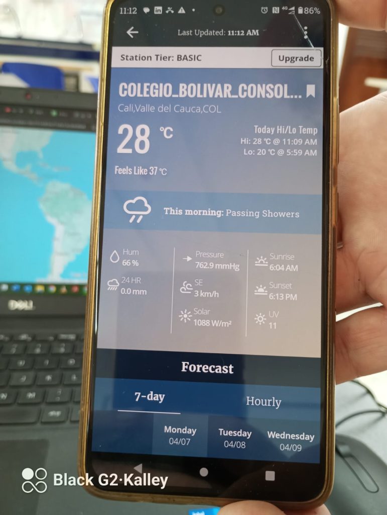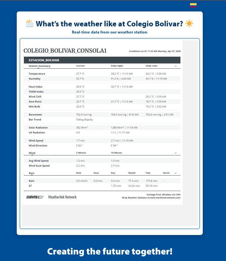 To access this information go to your AppStore and download the link to Davis Weatherlink App. Download this and make an account. Once this is done please login and then find Colegio Bolivar Consola 1. This will then give you data on our particular weather station.