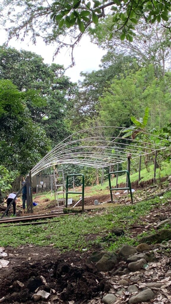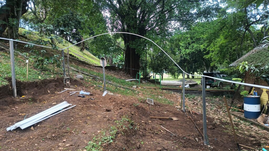 Once posts were in place and checked, Gustavo Ledesma, myself and a couple of BGVs set about the task of putting up our roof, made of PVC!
