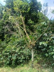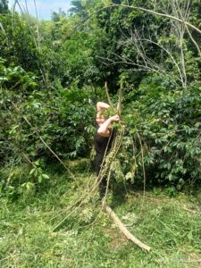 A number of year ago, we planted estacas of Mata Raton, Glirecidia sepium, a tree adapted to our environment, that is resistant to, and responds well to pruning. It is a nitrogen fixing tree, meaning that it has root nodules on its roots that are symbiotic, and enable the plant to capture nitrogen from the atmosphere, turning it into protein in the plant. The leaves and branches of mata raton have high amounts of nitrogen, which are then harvested from the plants and used as a green fertilizer, by letting it break down in situ, providing plants with nitrogen directly.