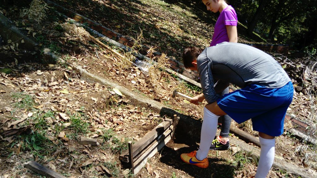 Though a good deal of work was done early on to construct the staircase the agric students were all involved in digging out terrace #1 and constructing the stone wall. Now with smaller groups working on the terrace path and terrace #2, and with the addition of a saw, Laura, Manuela and Gabriel have secured the first step with wood and stakes. The space between the stakes and wood needed to be filled in with soil and compacted. They are going to continue with this, reusing wood that was salvaged to secure the entire staircase and avoid erosion of the steps and to provide a solid platform for moving to the top of the garden.