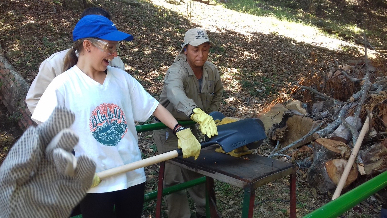 Federica learning to sharpen a bareton with Edelberto Builes and Alduverth Ipia