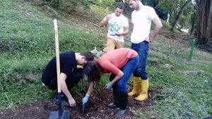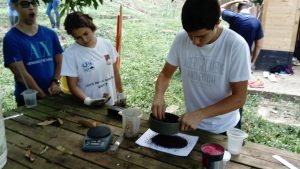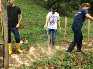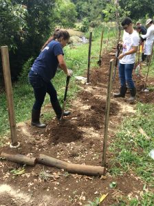 Students measuring and adding agricultural lime to the soil, then digging it in.