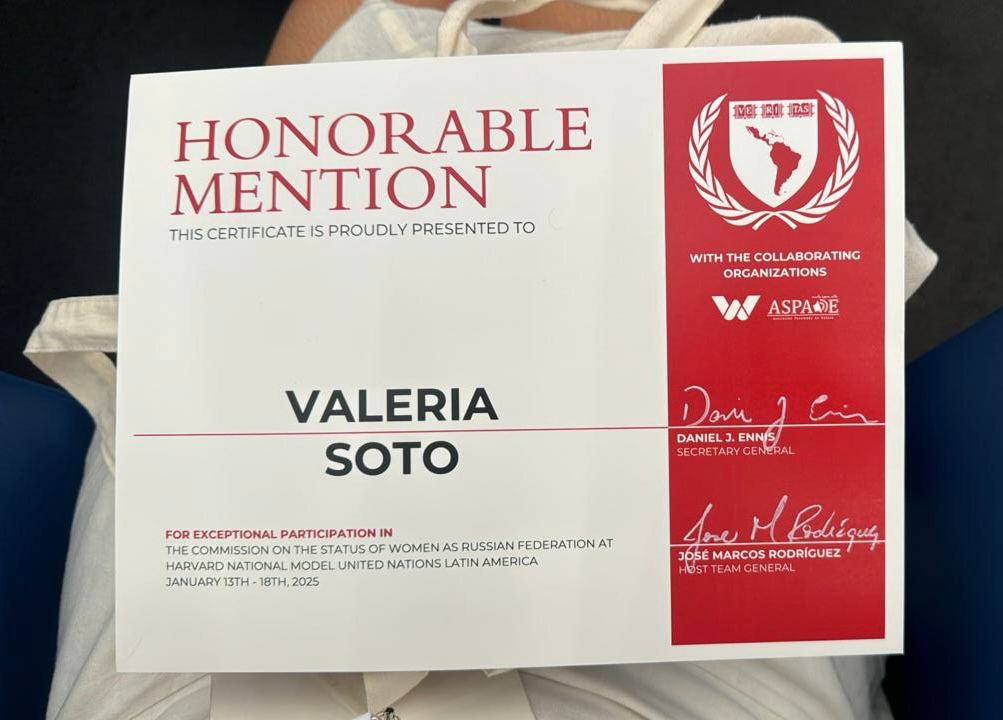 This year, we brought home the First International Award from the Model UN at the Harvard Model United Nations in Panama. Student Valeria Soto participated in the Commission for the Status of Women (CSW), representing the Russian Federation, and received one of the five possible awards: an Honorable Mention. Valeria participated in a large committee with 52 delegations.