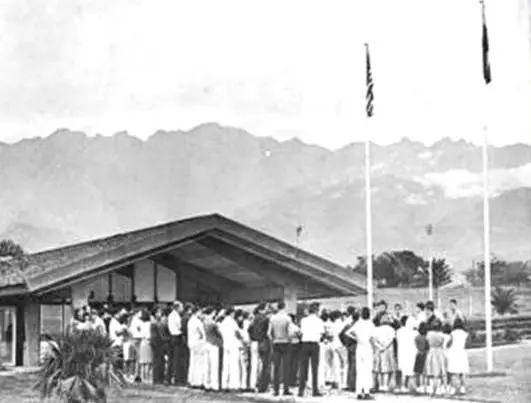 Each student brought their own desk. A kiosk was built for students to use during recess and lunch. Principal: George P. Young (1954–1958).